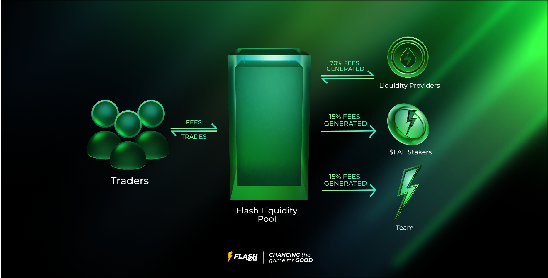Los Traders son usuarios que quieren usar el DEX para hacer long o short de cualquier activo disponible en el pool en su nivel deseado de apalancamiento. Los Traders colateralizarán su posición usando cualquier activo y luego obtendrán la exposición al precio del activo en el pool. Cuando los traders obtienen ganancias, se les paga del pool; cuando pierden, sus pérdidas fluyen de vuelta al pool, beneficiando a los LPs.